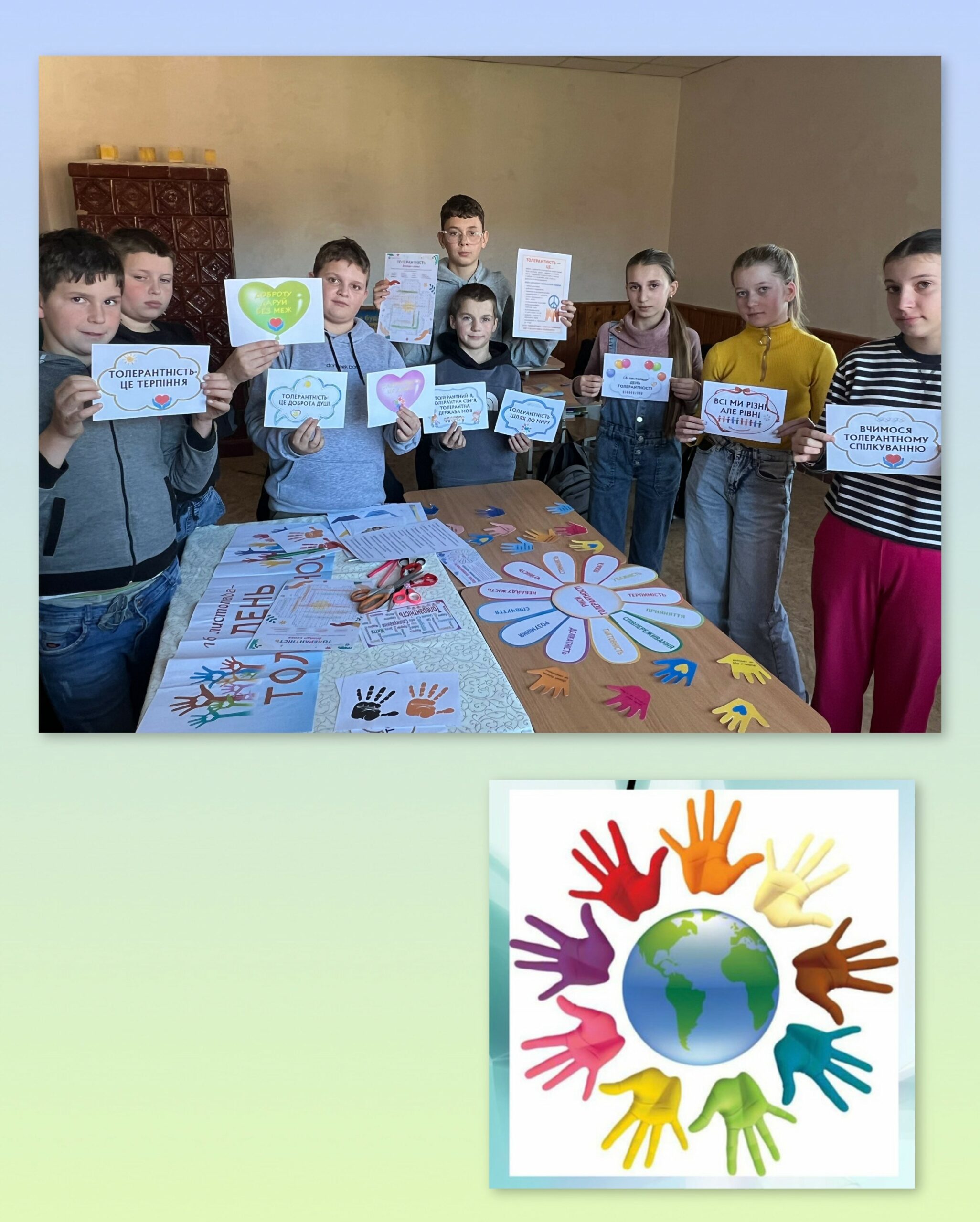 Для учнів 7–8 класів (вчитель Федишин Т. Б.) було організовано тематичний флешмоб «Долоні толерантної молоді». Школярі створили колективну інсталяцію зі своїх долонь, на яких написали слова й побажання, пов’язані з толерантністю. Ця активність стала символом єдності, відкритості та готовності молоді будувати взаємини на засадах поваги та взаєморозуміння.
