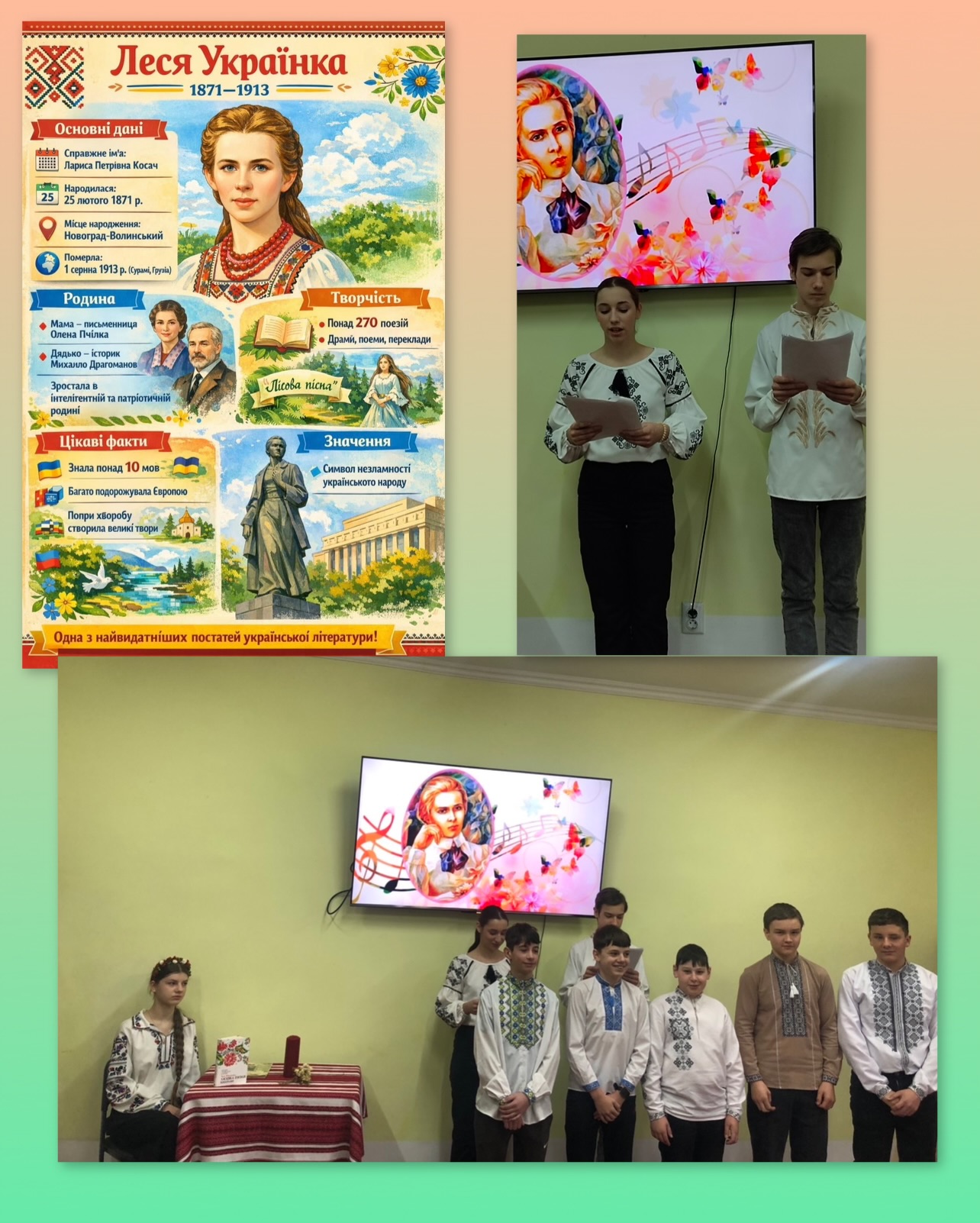 Учні 6–8 класів разом із учителем української мови та літератури Болюк Н. Я. виразно читали поезії Лесі Українки, осмислювали їхній зміст, який і сьогодні звучить як виклик страху, як заклик не коритися долі, берегти гідність, свободу та національну самосвідомість.