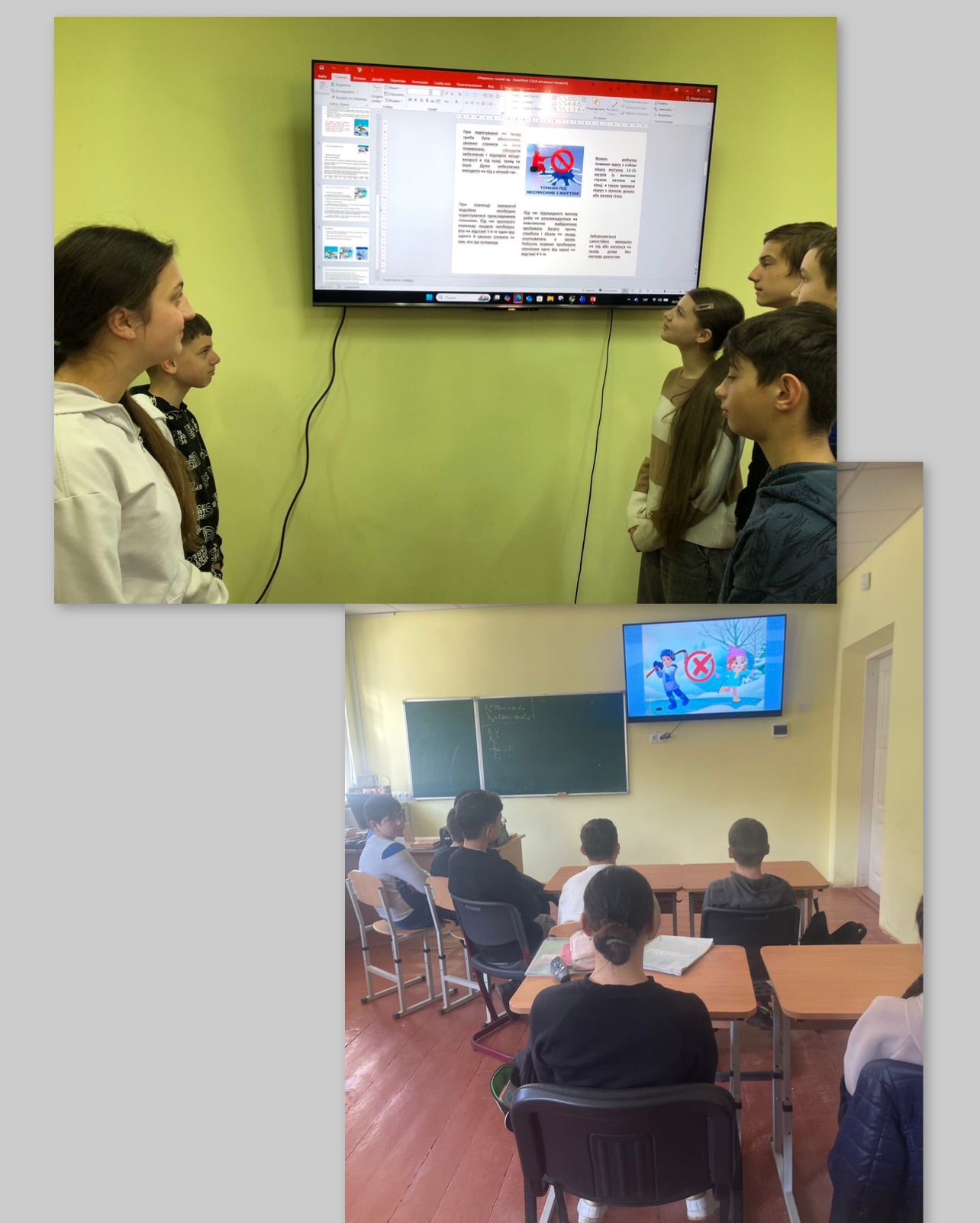 У 7-8 класах класні керівники Зубрицька І. М. , Болюк Н. Я. провели бесіду про небезпеку тонкої криги. Учні дізналися, чому лід на водоймах може бути небезпечним, як визначити його міцність та яких правил слід дотримуватися, щоб уникнути нещасних випадків. Під час заняття школярі обговорили ситуації, які можуть виникнути на льоду, та пригадали правила безпечної поведінки поблизу водойм узимку.