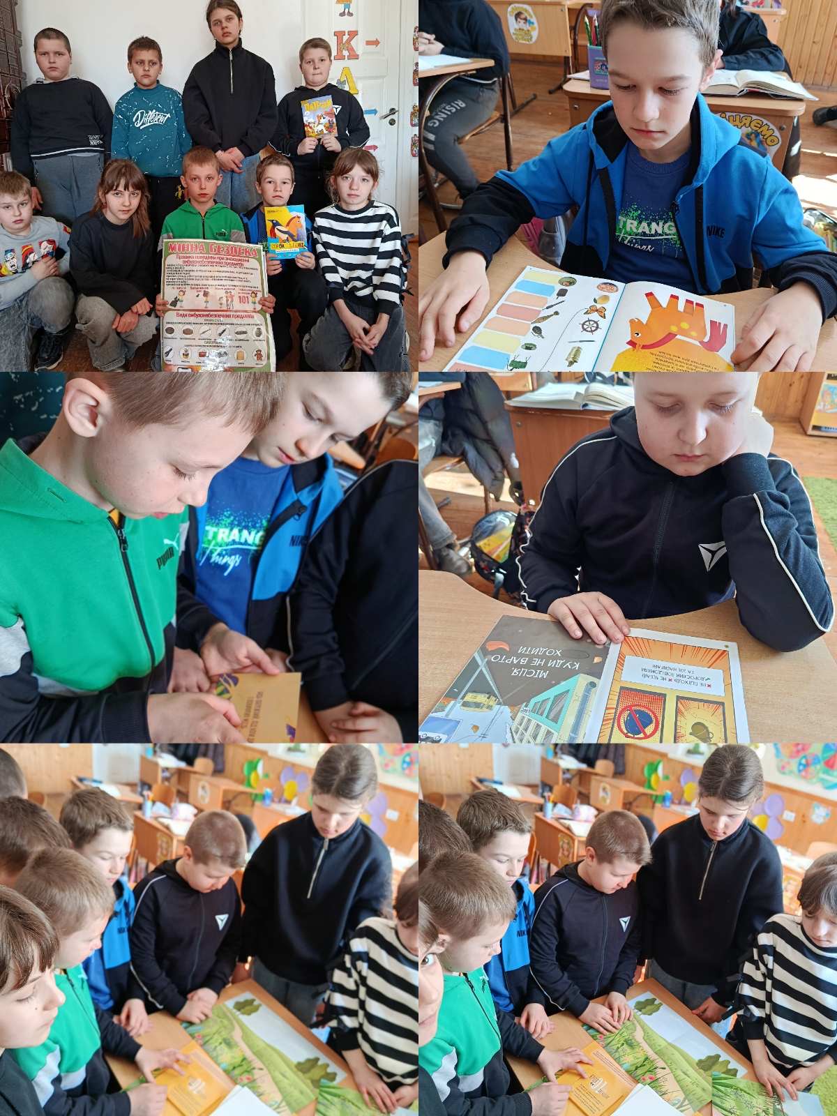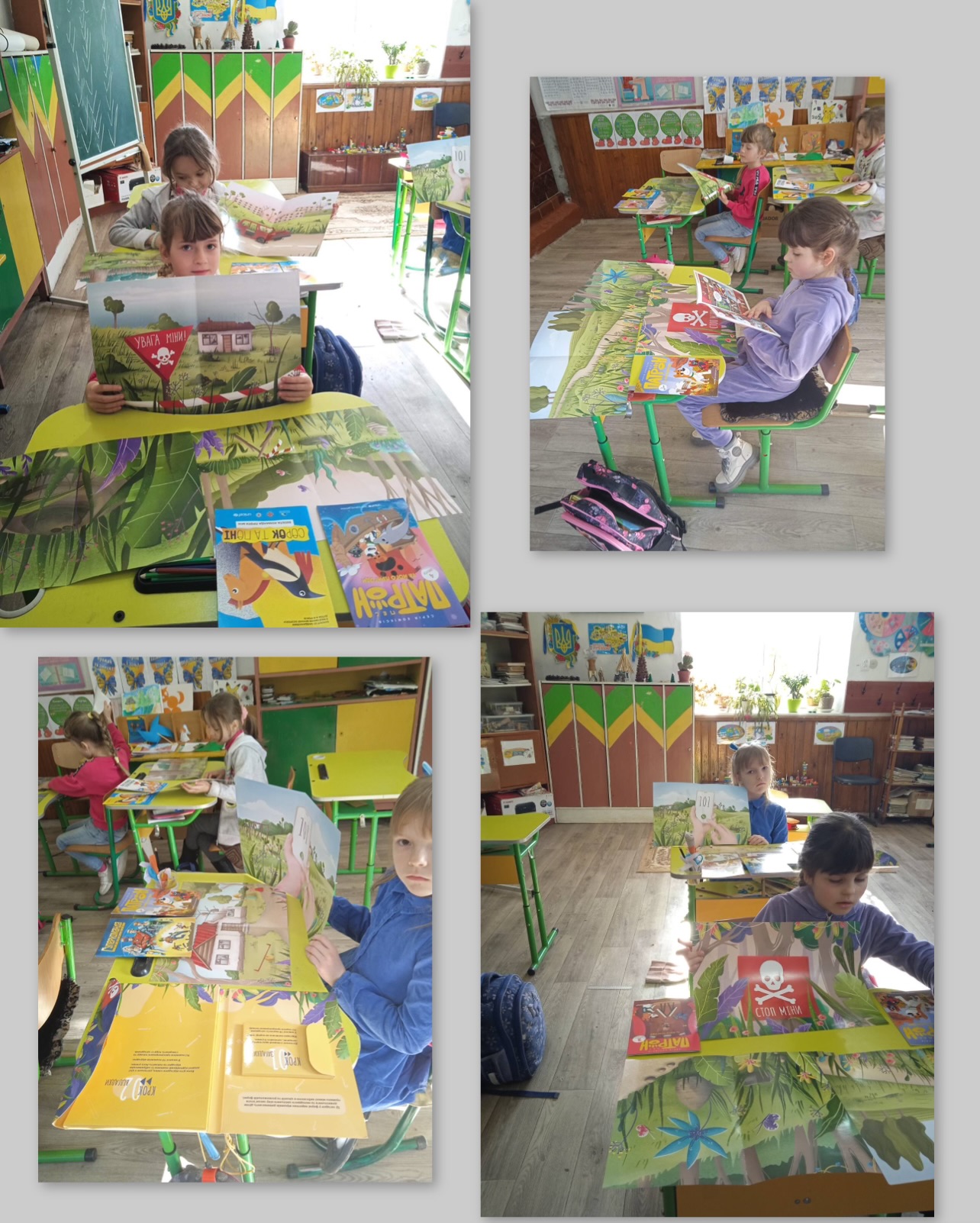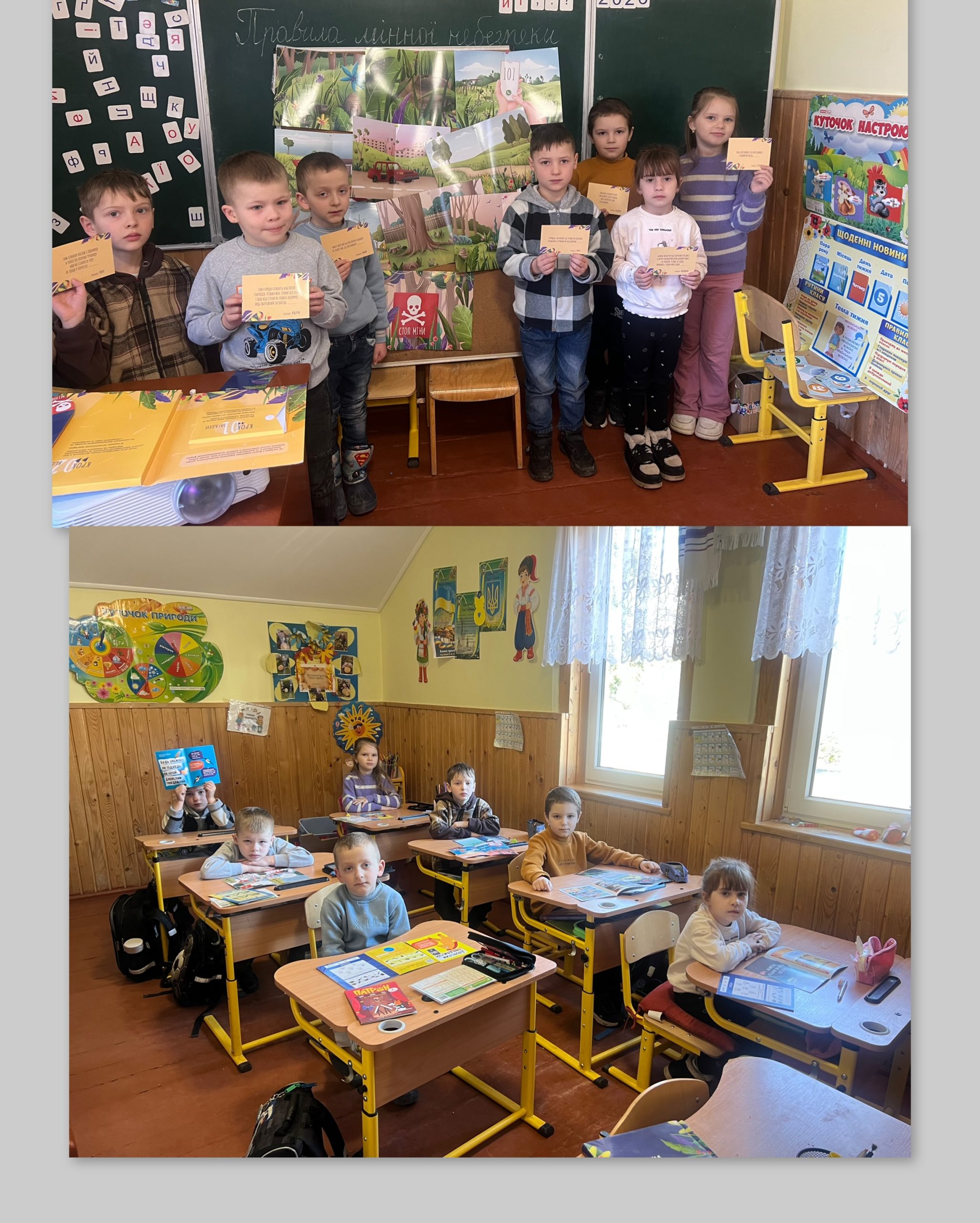 Учні 1–4 класів разом із класними керівниками взяли участь у пізнавальних заняттях, під час яких розглядали серії коміксів про Пса Патрона та його пригоди, працювали з буклетом із завданнями «Весела команда проти мін — Сорок та Поні», а також розгадували загадки на тему мінної безпеки.
